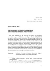 abstract = "This paper elaborates on the protection of creditors in cross-border conversions, mergers and divisions, according to Directive 2019/2121/EU as regards these cross-border operations. After presenting the protection mechanisms available to creditors in cross-border operations prior to the adoption of the 2019 Directive, as well as the risks faced by creditors in such events, the author presents the system of creditor protection introduced by the Directive. Both creditor protection mechanisms in the broader sense (which are not designed exclusively for creditors) a nd the ones in the narrower sense (which are created only for their protection) are presented in the central portion of the paper. Among the latter group, the general protection mechanisms available for each cross-border operation are analysed, followed by the mechanisms that are specific to individual operations.",
