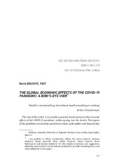 abstract = "The aim of the article is to provide a general, broad picture of the economic effects of the COVID-19 pandemic, without going into the details. The impact of the pandemic on economic growth was sharp, with sudden and deep decline, followed by complete and swift recovery. Both the supply and the demand side contributed to this dynamic, based on the same factors (morbidity and mortality, behavioural adjustments of individuals, and government pandemic control measures), although with quite distinctive mechanisms of impact. It was the uncertainty of both the supply-and demand-side economic agents that was decisive for the sudden drop in the level of economic activity. Macroeconomic policies, both monetary (quantitative easing) and fiscal (budgetary deficits) proved timely and prevented a global depression. In the aftermath, the side effects of these policies are substantial inflation, increased basic interest rates to counter that inflation, increased sovereign debt, and its threatened sustainability.",