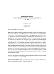 Adjustment (Anpassung / Angleichung) is an institute of Private International Law which means non-application or modified application of substantive rules of applicable law. The method is mostly used in German scholarly writing and court practice. The need for adjustment is usually generated either by a lack of rules 'Normenmangel' or by an abundance of norms (Normenhaufung). It occurs if the conflict of law rules refer to the applicability of substantive law pertaining to two or even more legal orders which, when applied together, produce a result which is either contradictory or which is unintended by any of the applicable legal orders. The need for adjustment is deemed to be justified by the doctrine for grounds, such as the requirement for unity of legal order, the requirement for elimination of normative contradictions which are sometimes logically untenable, etc. The modern approach to the need for adjustment is depicted as accidental discrimination which contradicts the principl...e of equality before the law. By relying on provisions contained in the Russian-German Consular Convention of 1958, the author demonstrates that any method of adjustment violates the right to a fair trial and vested rights as well.